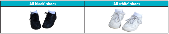 - Students are not permitted to wear shoes with different colours or designs (e.g. all black shoes with white details).