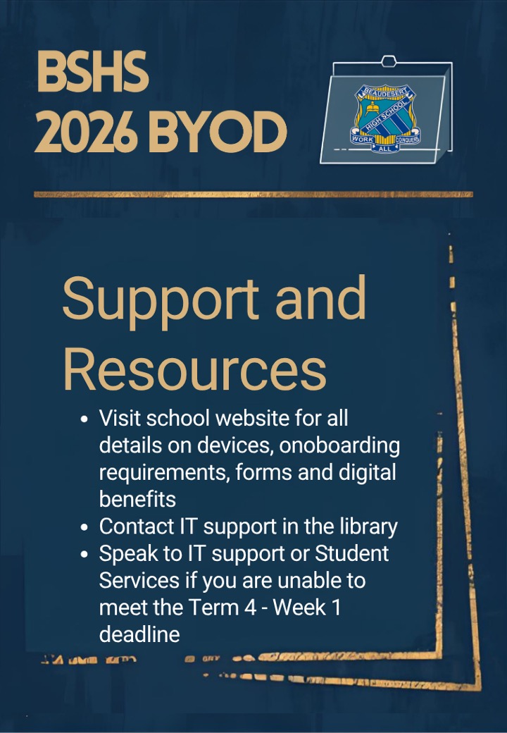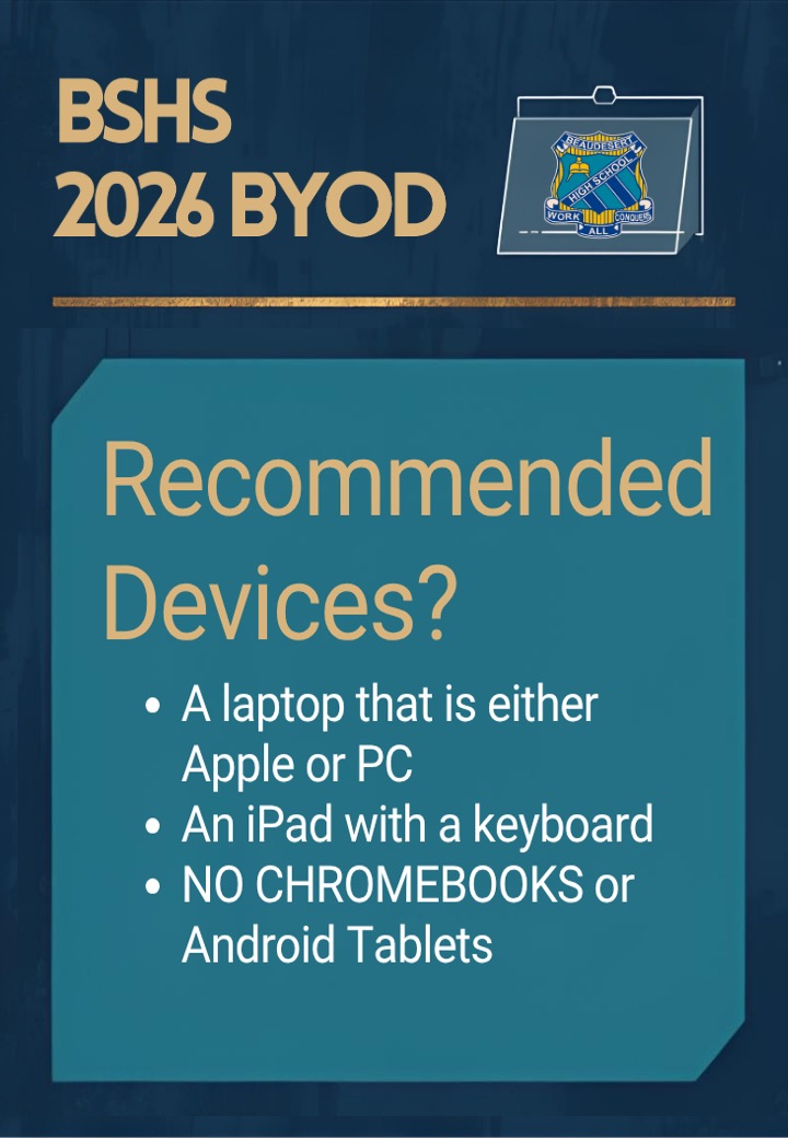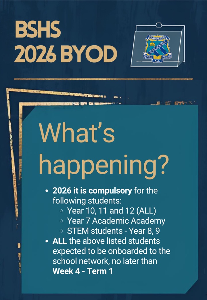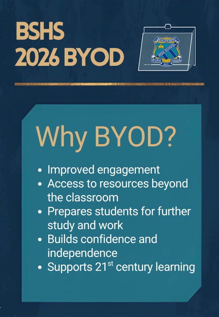 BYOD stands for "Bring Your Own Device". Student devices are connected to the school network allowing students to access files and printers for learning purposes.